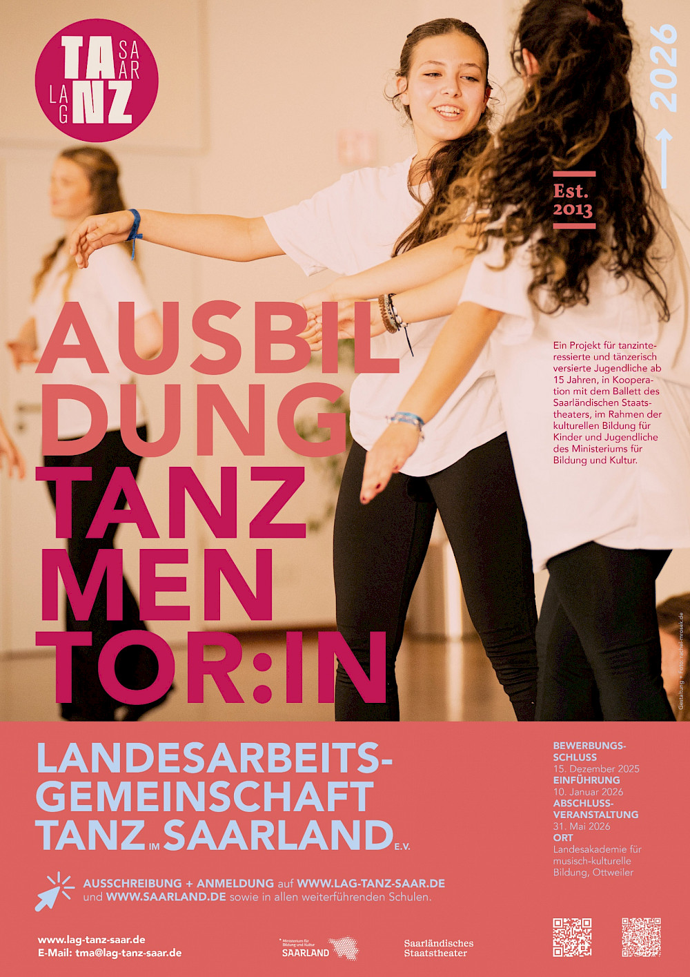Die Ausbildung findet im Gästehaus Braunshausen sowie in der Landesakademie für musisch-kulturelle Bildung Ottweiler statt; die Teilnehmer:innenzahl ist auf 15 Mentor:innen begrenzt. Ein Projekt im Rahmen der kulturellen Bildung für Kinder und Jugendliche des Ministeriums für Bildung und Kultur. Konzept und Durchführung in Zusammenarbeit mit dem Ballett des Saarländischen Staatstheaters.